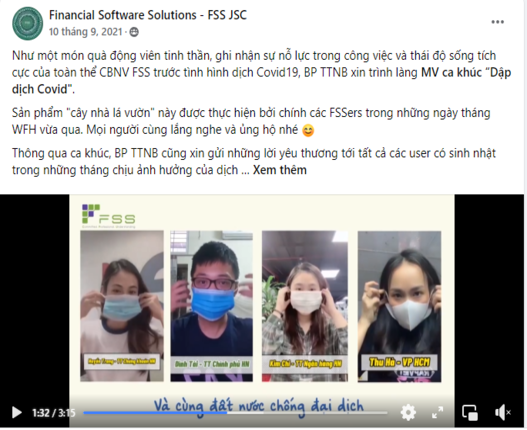 – Các chương trình online gắn kết nội bộ cũng được phòng nhân sự chú trọng triển khai nhằm giúp anh chị em FSS giải trí và tăng tính giao lưu tương tác sau một thời gian dài work from home như minigame, các cuộc thi online, video ca nhạc,…